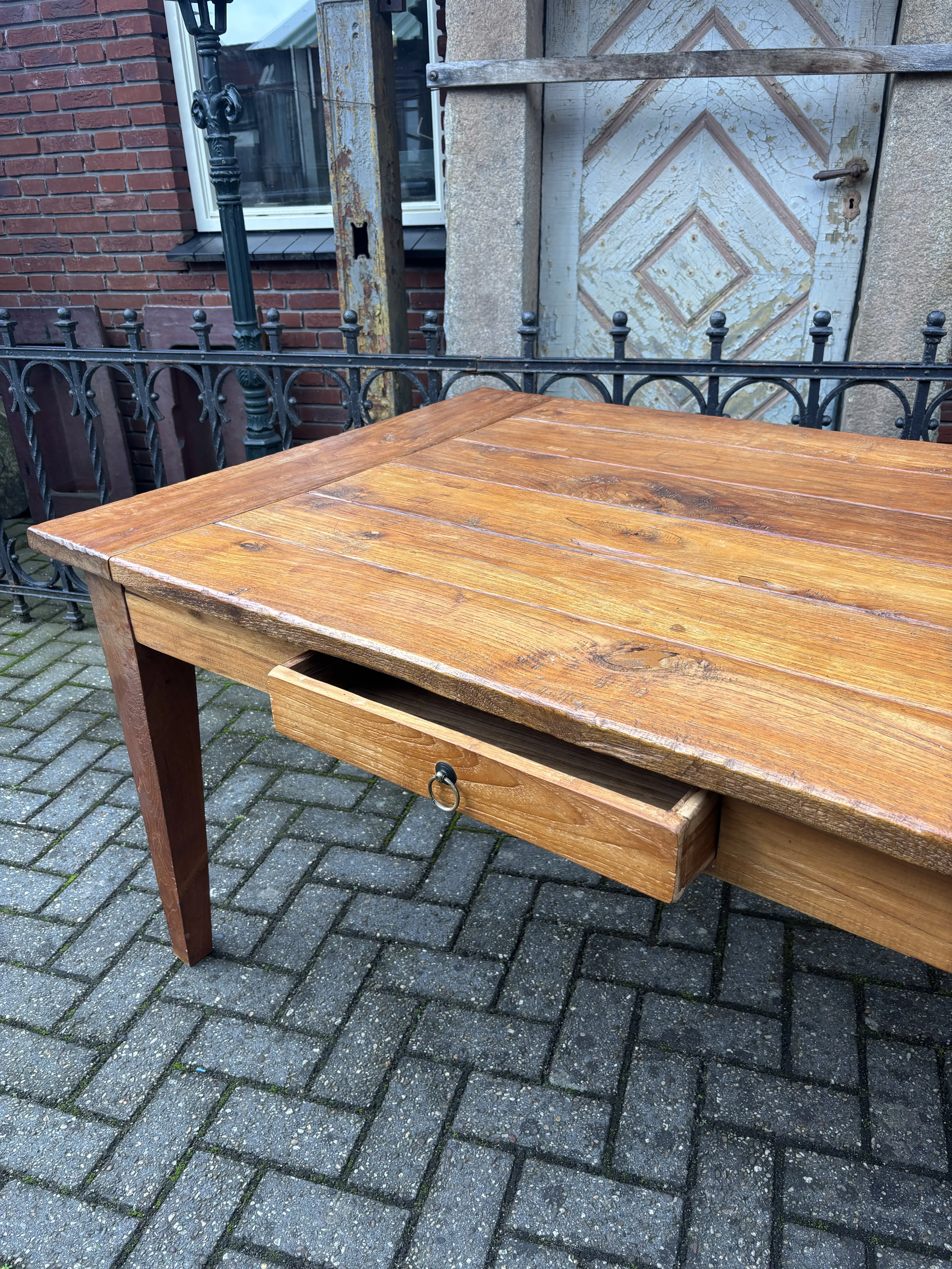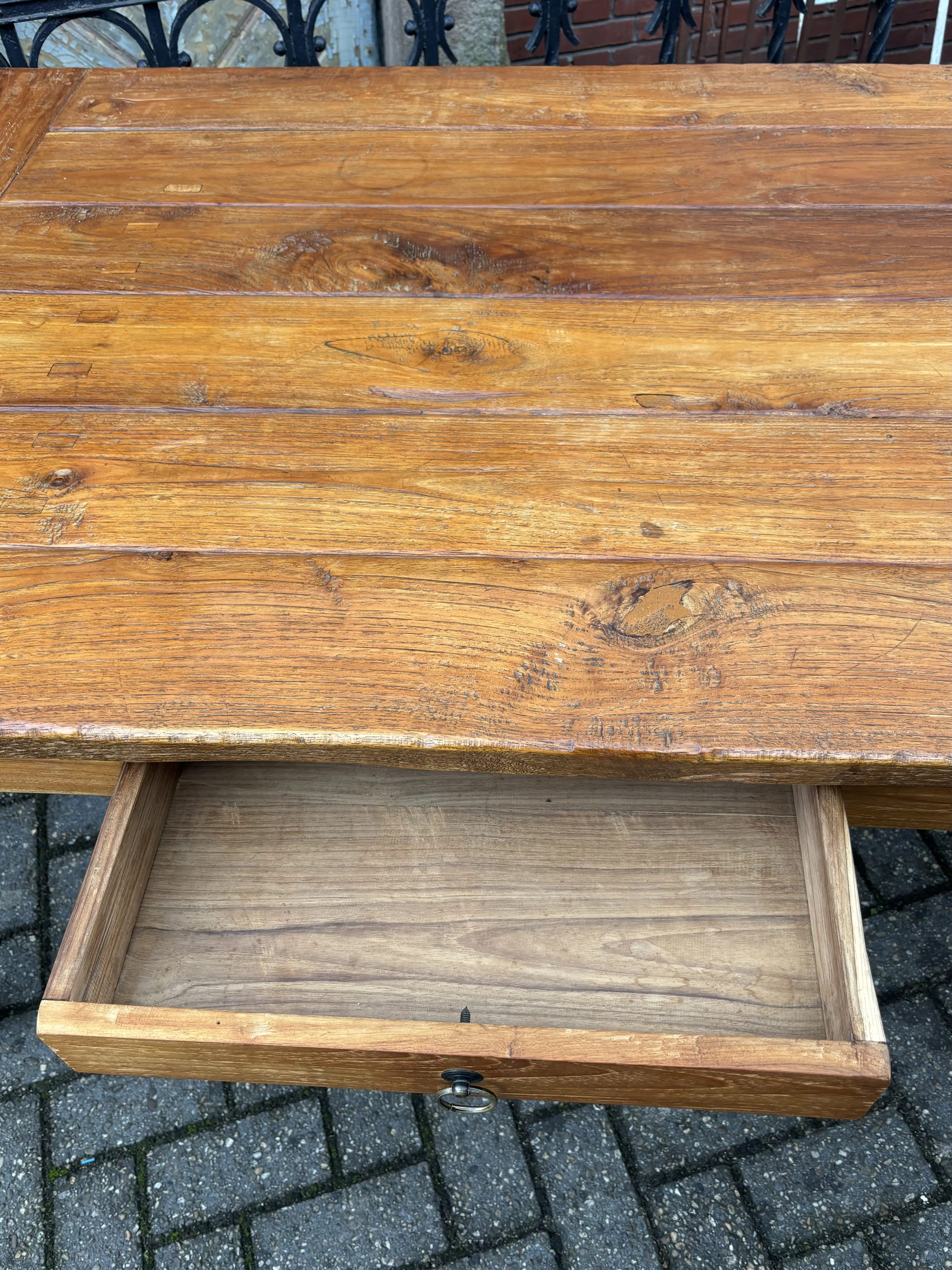 Hier ein wunderschöner, alter, massiver Esstisch, Bauerntisch, Arbeitstisch, Schreibtisch etc. (Bild 1-9). Teakholz, +/- 1960’er Jahre, handwerkliche Fertigung, 2 Schubladen mit Messingbeschlägen. Sehr guter Originalzustand mit einer traumhaft schönen Maserung und einer wunderschönen authentischen Patina, sofort wohnzimmer-/bürotauglich.